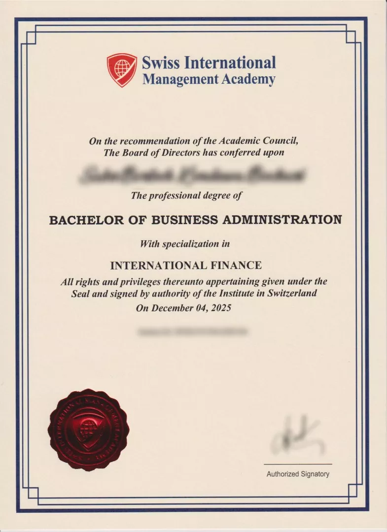 Participants who fulfill the program requirements will receive a Bachelor of Business Administration (BBA) Degree from Swiss International Management Academy, Switzerland.