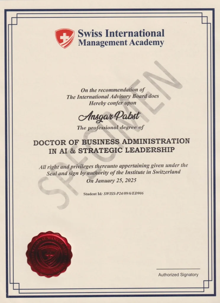 Participants who fulfill the program requirements will receive a Doctor of Business Administration in AI & Strategic Leadership Degree from Swiss International Management Academy, Switzerland.