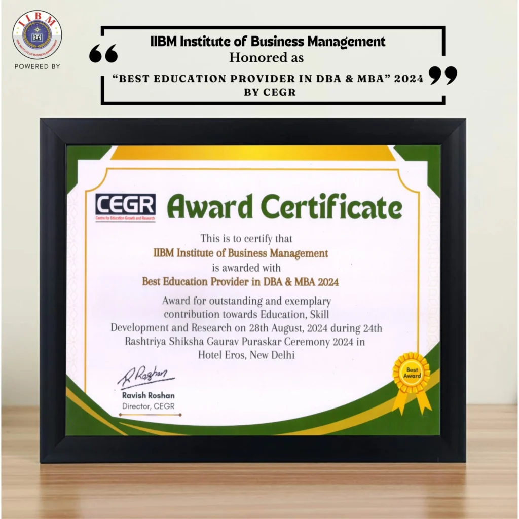 It’s with great pleasure that we announce IIBM Institute of Business Management has been awarded the prestigious title of “Best Education Provider in DBA & MBA 2024” by the Centre for Education Growth and Research (CEGR).