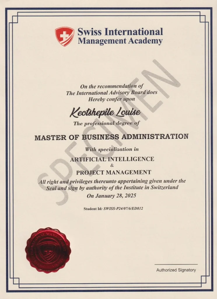 Participants who fulfill the program requirements will receive a Master of Business Administration in AI Degree from Swiss International Management Academy, Switzerland .