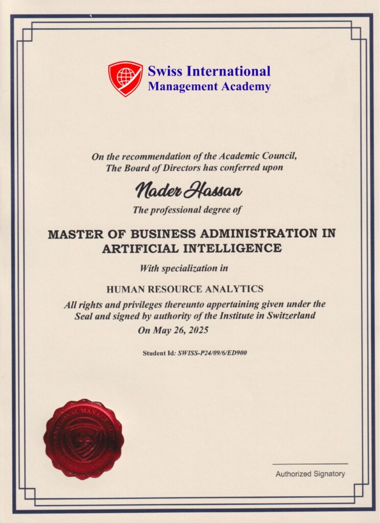 Participants who fulfill the program requirements will receive a Master of Business Administration in AI Degree from Swiss International Management Academy, Switzerland .