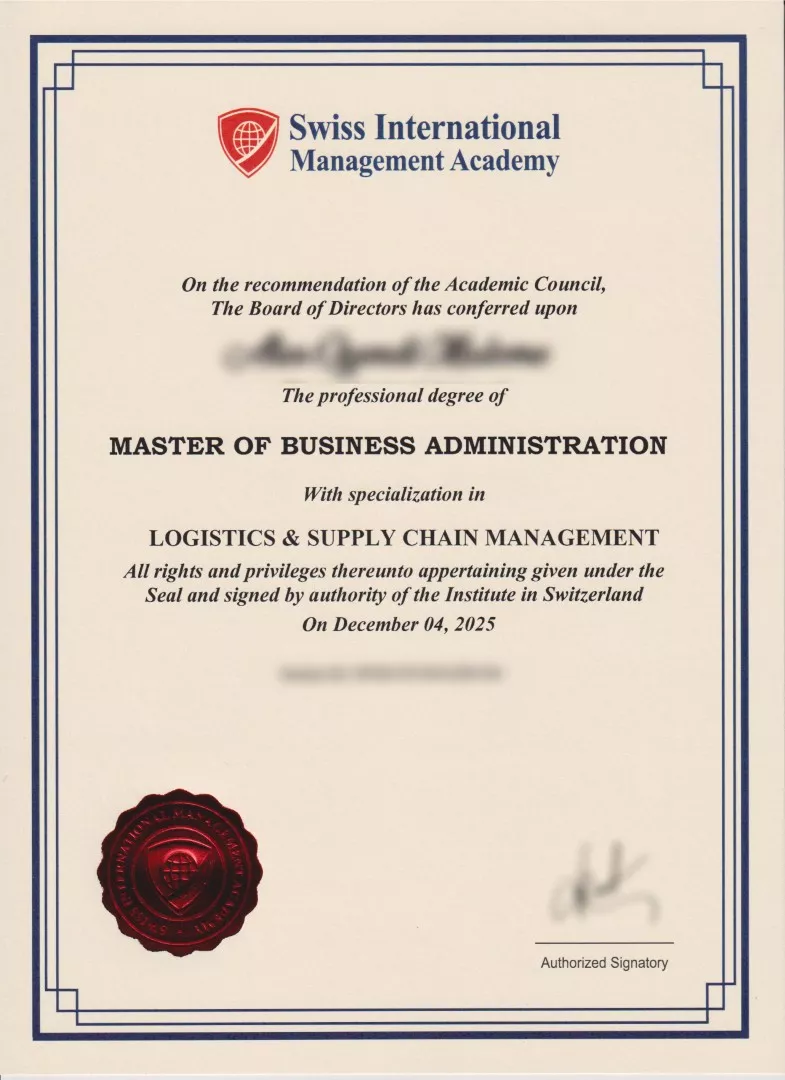 Participants who fulfill the program requirements will receive a Master of Business Administration Degree from the Swiss International Management Academy, Switzerland.